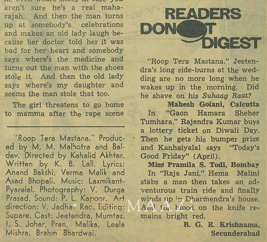 Roop Tera Mastana (1972) Review - Filmfare December 15, 1972